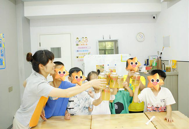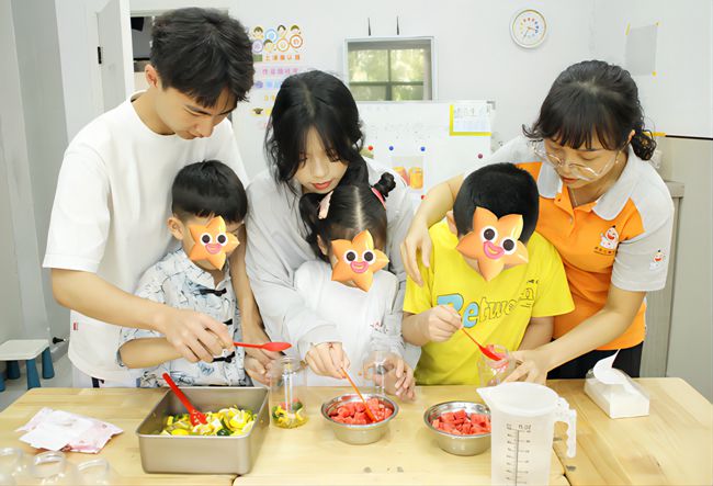 图为实践队成员与“星星的孩子”共同制作水果茶的场景。 刘宇 供图