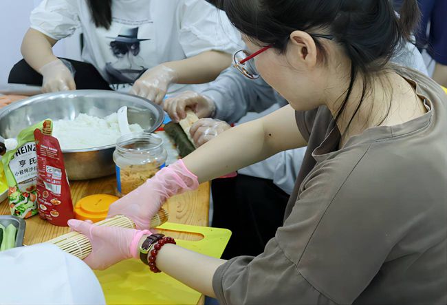 图为美食节活动中实践队成员与老师一起制作寿司的场景。 张振海 供图