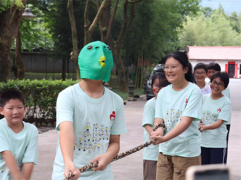 二、活动时刻Part1 运动会挥洒汗水,凝心聚力。在“抓住定海神针”的项目比拼中,小营员们围成一圈,蓄势待发。随着裁判员的哨声,同时放开手中木棍、移动位置、抓住下一根棍子,动作敏捷,配合默契,展现出了惊人的协作能力。接下来开始的拔河比赛,更是将运动会推上了高潮。志愿者和孩子们同心协力,喊着“一二一”的口号,将力量汇聚到一条绳子上,一点一点地拉着对手向后退。即使夏日炎炎,汗流浃背,也难以抵挡他们必胜的决心。