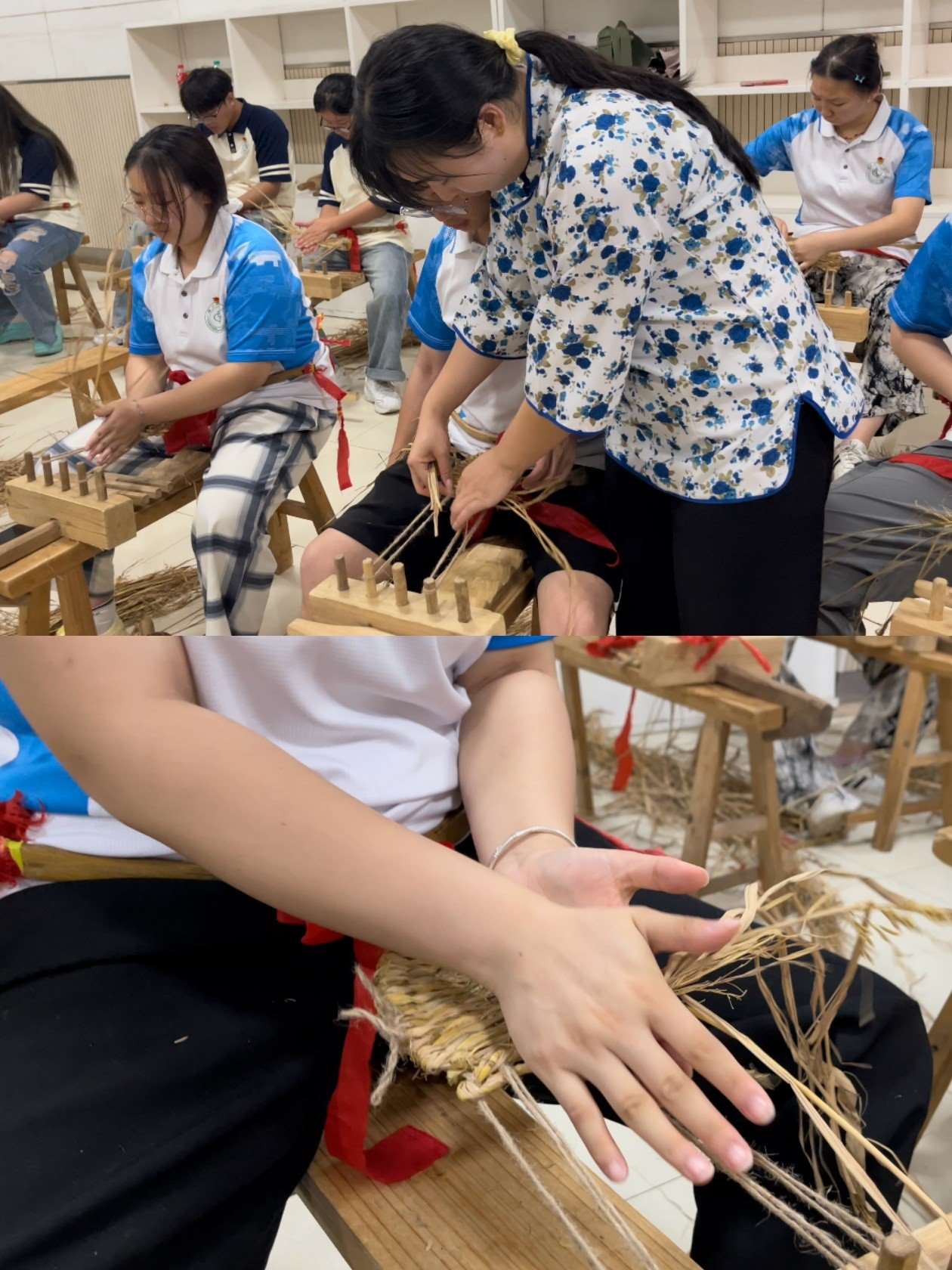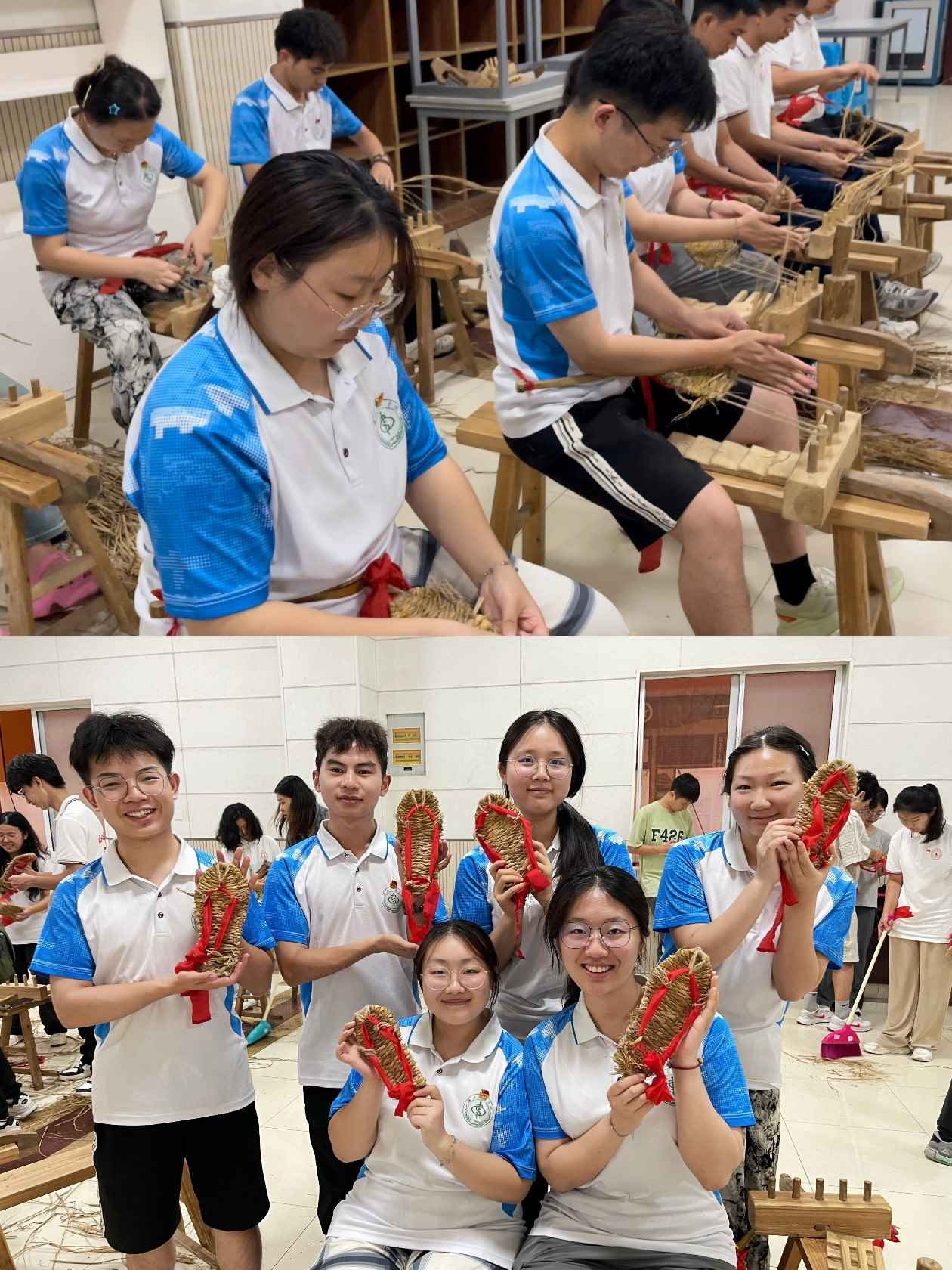 草鞋又名“扉”,相传为黄帝的臣子不则所创造。井冈山斗争时期物质条件十分匮乏,穿草鞋、打草鞋是每个战士的军事装扮和行军技能。中心特邀专业老师为队员指导编草鞋,“一系一搓一挽一编一压一敲,草鞋轻松编”,念着口诀,伴着激昂的革命歌曲,一双双草鞋就编制完成了,草鞋很小,只有二十多公分长,草鞋也很大,走过了万里征途。中心老师还让队员脱下脚上舒服柔软的鞋子,换上自己亲手制作的草鞋,硌脚行走的每一步都让队员们更加深刻体会那段艰难岁月。
