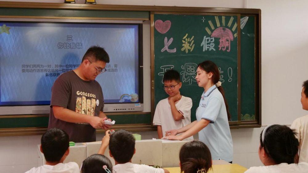 开班第一天,队员们作为各班级带班老师走进教室开启七彩假期第一堂课,带班老师着重强调了防溺水安全和交通安全问题。向孩子们介绍本次七彩假期内容丰富的课程,包括古典舞、拉丁、美工、体育、心理、科学小实验等,以及形式多样的特色活动,包括制作回忆录、积分拍卖会。