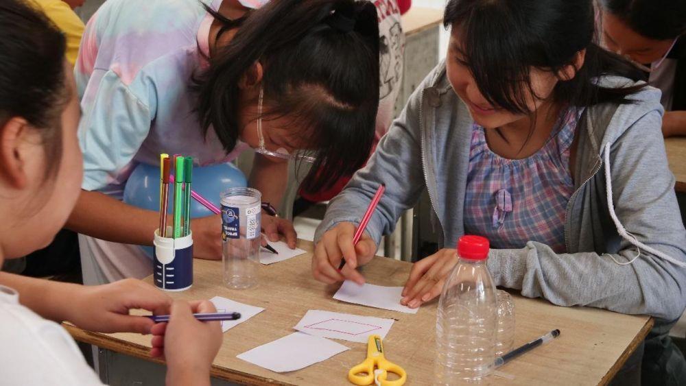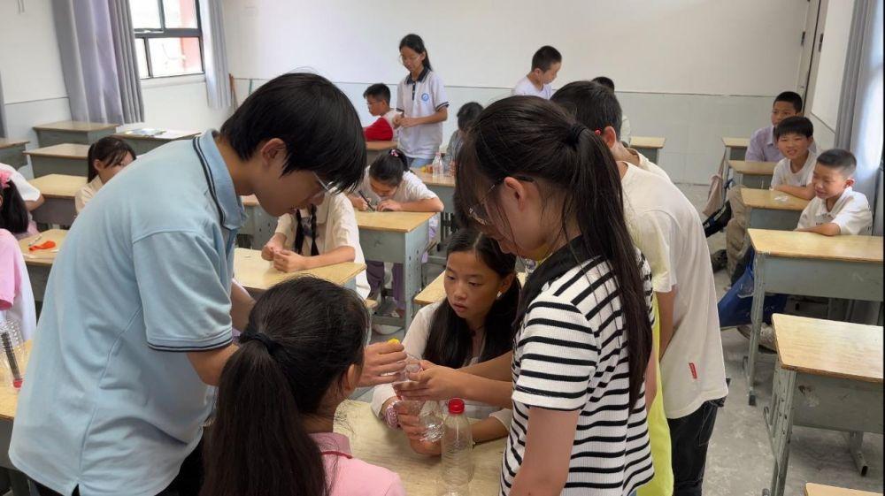 图为队员带领同学们上科学小实验课程