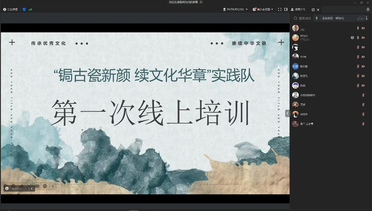 中国青年网菏泽1月21日电(通讯员:张旭)近日,以“锔古瓷新颜 续文化华章”为名的实践队伍,为了更好地传承与发扬古陶瓷修复技艺,组织了一场别开生面的线上培训活动。此次培训由队长赵国盛主持,全体队员通过视频会议平台积极参与,共同学习古陶瓷修复的相关知识。会议期间,队长赵国盛对各位队友的任务分工做了一系列安排并详细指导各位同学如何撰写发布新闻稿,确保后续实践工作能够顺利开展。