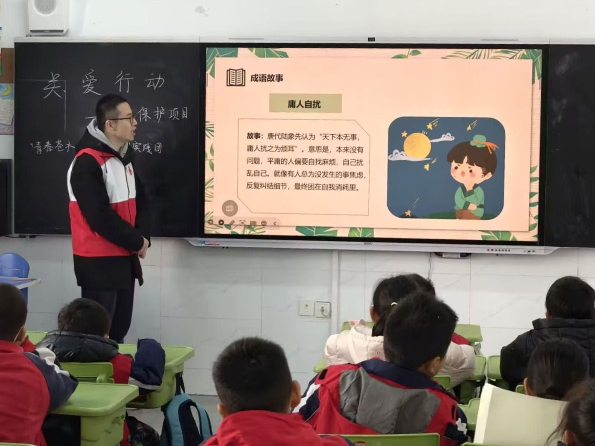 心理专场聚焦“换个角度看问题 拥有乐观心态”,为孩子们送上情绪管理“金钥匙”。志愿者先讲述“庸人自扰”的成语故事,通过古人无端担忧天塌地陷而寝食难安的典故,让孩子们明白“很多烦恼源于凭空臆想”。随后用“半杯水”趣味案例拆解ABC理论:面对“水杯只剩半水”的现状,沮丧者纠结“只剩一半”,满足者感恩“还有一半”,生动诠释“改变认知就能转变情绪”的核心逻辑。