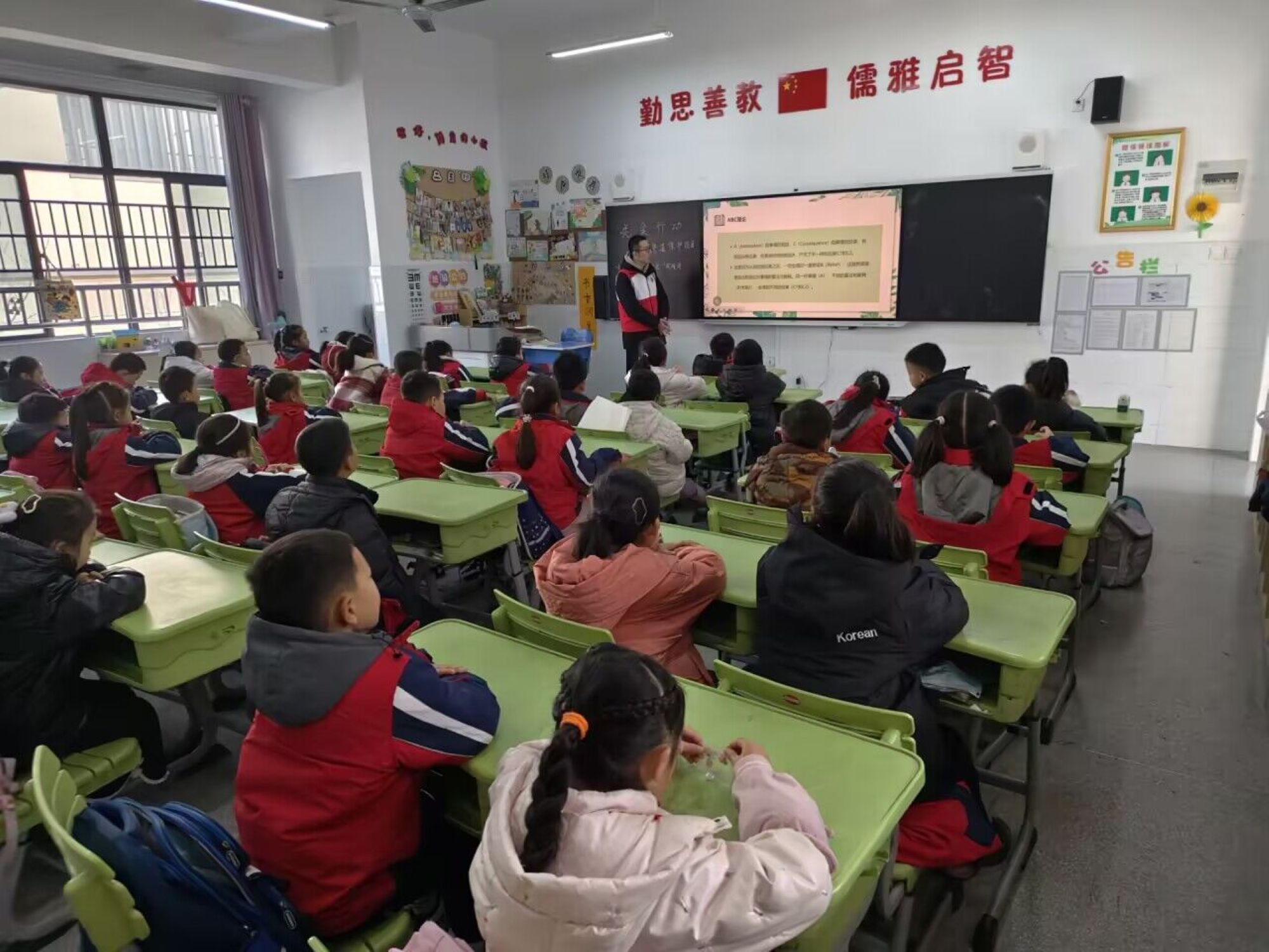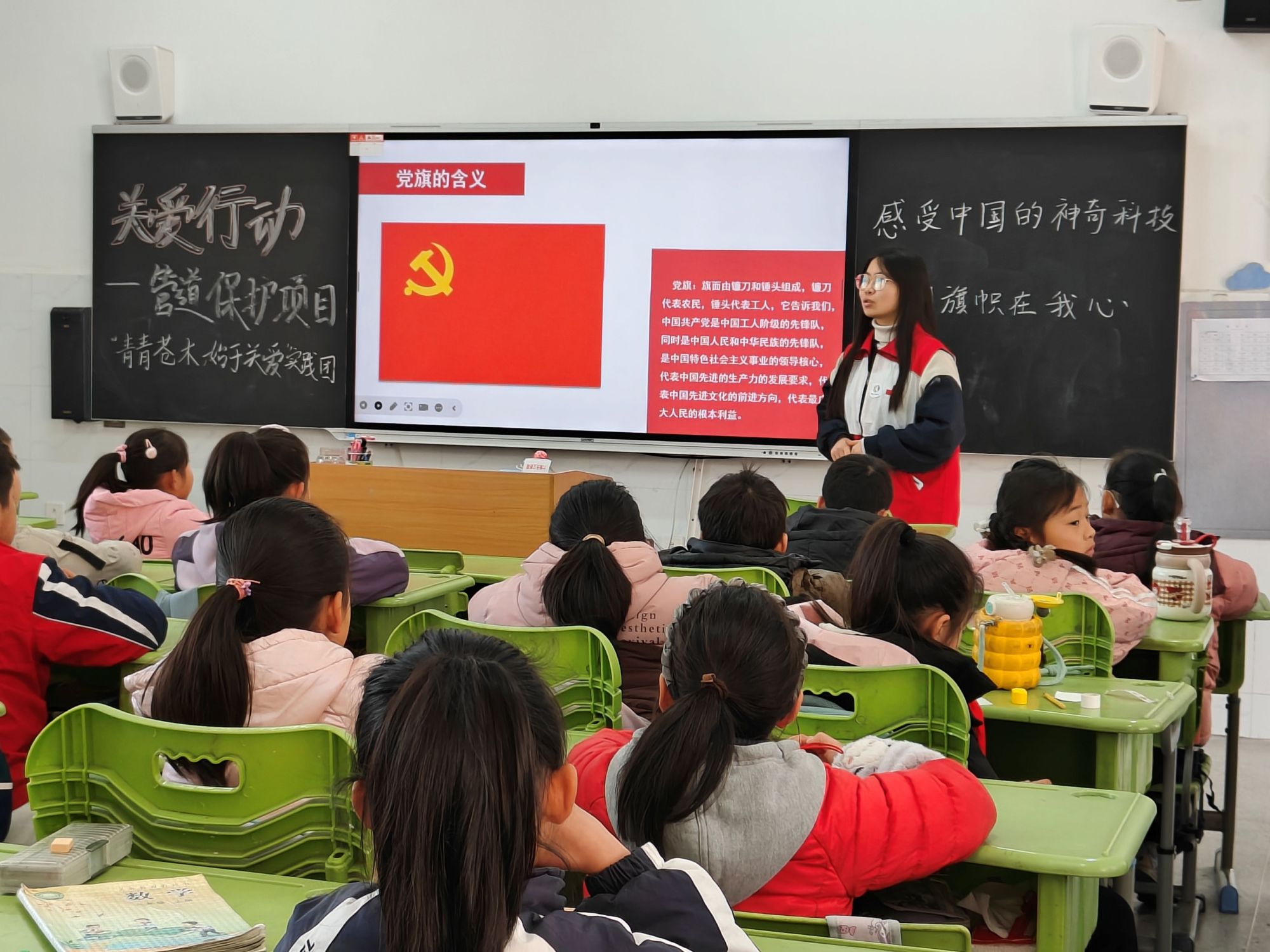 “思想铸魂课堂”成为孩子们认识家国的一扇窗。活动中,志愿者依次展示党旗、国旗、军旗、团旗、队旗。三年级(1)班孩子们看着旗帜说:“旗帜的红色,是不是代表革命和热血?”2024级人工智能专业的汪琪肯定并解释红色象征革命先辈的热血。同时,志愿者结合自身参与义诊、防“艾”等志愿服务的经历,引导孩子理解奉献与担当。孩子们纷纷举手描述心中的志愿者形象,教室里涌动着纯真热烈的情感。在介绍社会主义核心价值观时,志愿者讲述钱学森、陈祥榕的故事,生动解读“爱国”的含义,并引导孩子们完成《生活中的“24”字》学习单,让责任种子在幼小心灵里生根。