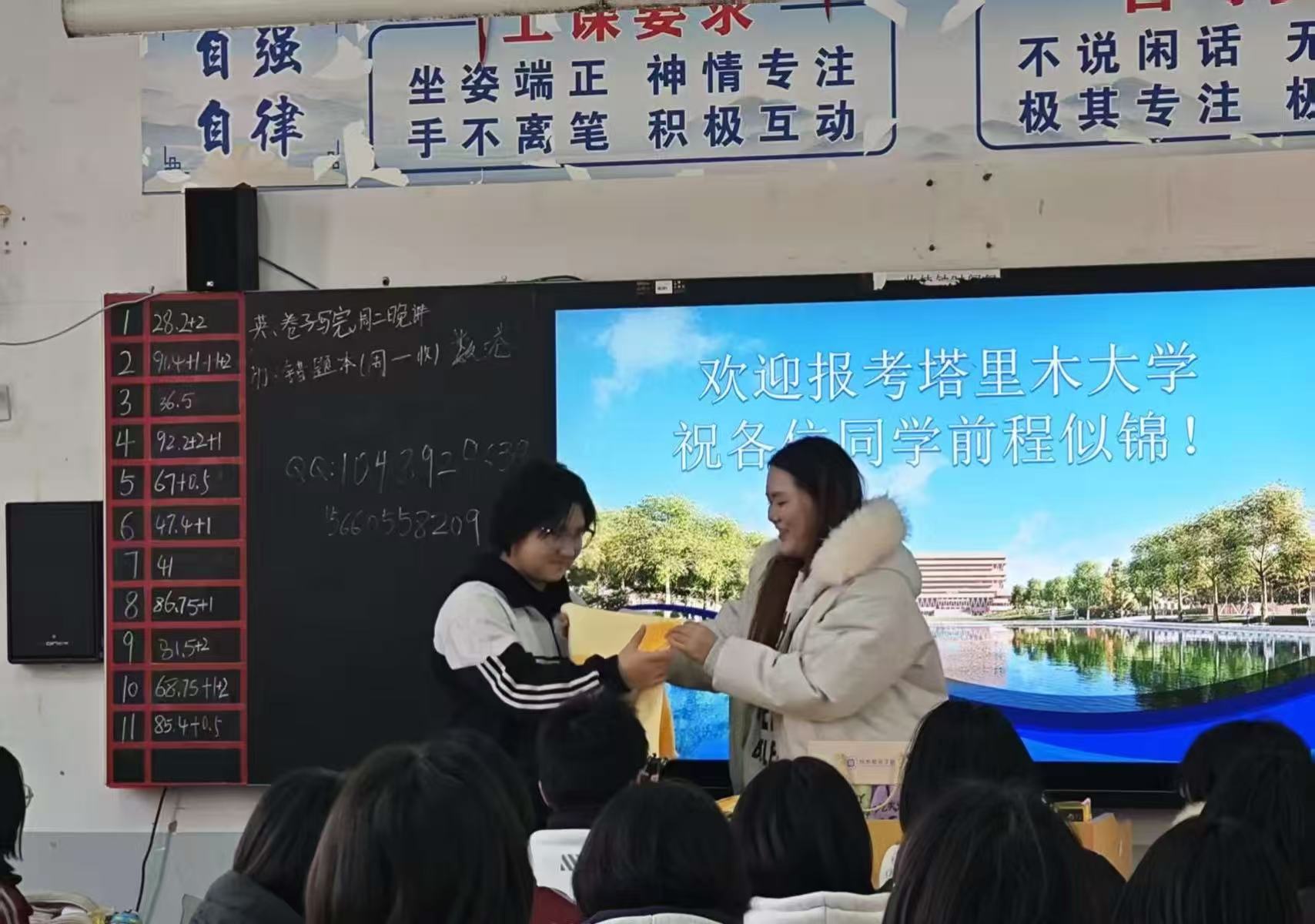 互动问答环节气氛热烈,孙梦洁耐心解答学子关于专业选择、集训瓶颈等问题,分享塔里木大学 “艰苦奋斗、自强不息” 的胡杨精神与自身边疆求学的成长感悟。现场展示的校园风光、实训作品等让学子对该校艺术氛围充满向往。此外,她还代表纺织服装学院赠送定制毛巾、学院徽章等文创周边,传递学校的设计实力与人文关怀。