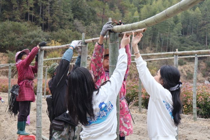 实践首站,团队抵达清流县嵩口镇丝瓜种植基地,沉浸式投身农事劳动、深耕基层调研。同学们褪去书卷气,挽起衣袖、拿起竹竿,在当地农户的耐心指导下,有序开展丝瓜种植前的搭架作业,从竹竿丈量、定位固定到交叉捆绑,每一个步骤都认真钻研、反复调整,切实体验农事劳作的艰辛与乐趣。劳作间隙,团队成员分组对种植户进行一对一访谈,细致记录当地丝瓜种植的品种特性、生产规模、销售渠道及发展痛点。