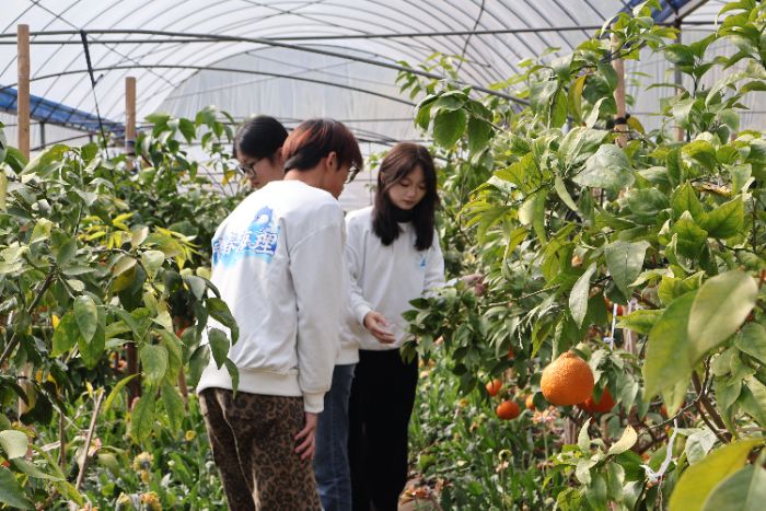 随后,团队走进现代化菌菇种植大棚开展专项田野调查在菌菇大棚内,同学们近距离观察菌菇的培育流程、生长周期及温控保湿技术,向基地技术员请教规模化种植的核心要点。最后团队深入大家细致了解果冻橙与非洲菊的共生种植模式,探究该模式在提升土地利用率、增加农户收益方面的优势。