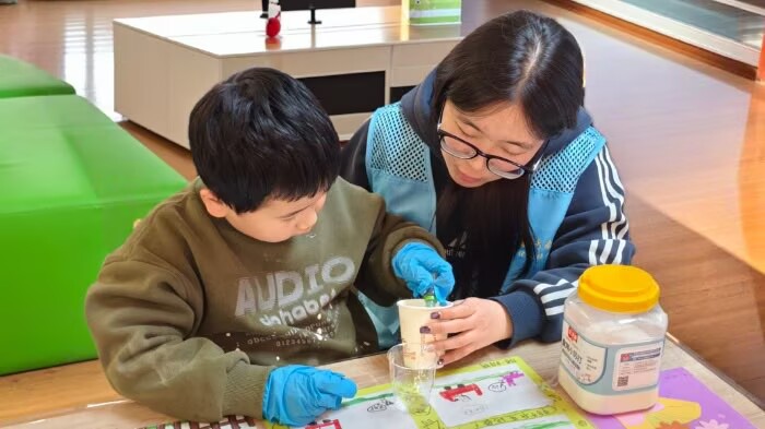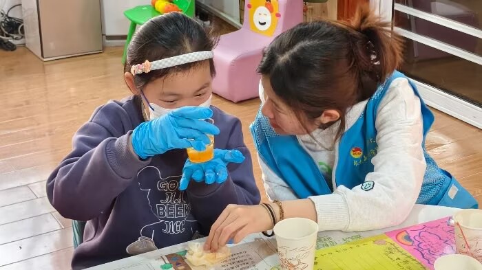 如果说动画与演示是让孩子们“看科学”,那么彩色风暴制作环节便是让孩子们“做科学”。志愿者先完整演示实验全流程,清晰讲解操作步骤与安全注意事项,叮嘱小朋友轻拿轻放玻璃器皿、不触碰口鼻实验材料,鼓励大家大胆尝试、细心观察。