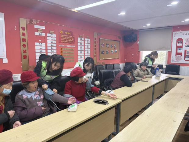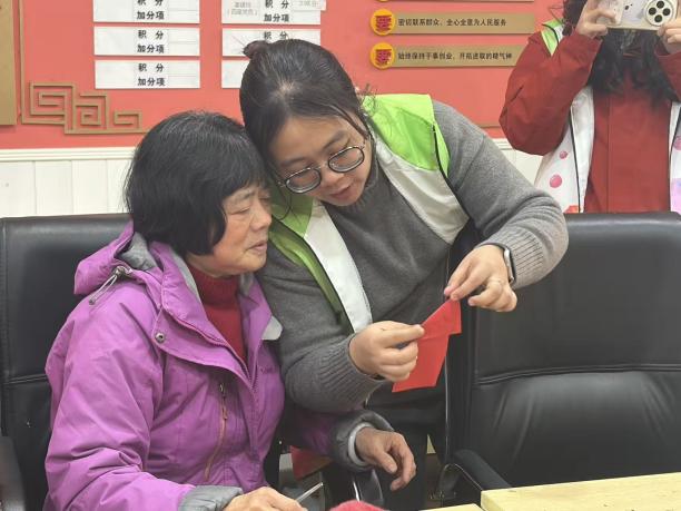立春送福,共迎新春。2月4日立春之日,志愿队再次走进南苑社区,为老人送上新春祝福。活动现场设置血压测量区,志愿者细致为老人检测血压,结合冬季气候讲解养生知识与用药禁忌,针对高血压、糖尿病等常见老年病提供个性化健康建议,让老人在家门口享受便捷的健康服务;手工环节中,志愿者指导老人制作新春灯笼、剪福字与生肖剪纸,指尖翻飞间,吉祥图案跃然纸上,浓浓的年味儿与社区温情在欢声笑语中传递。