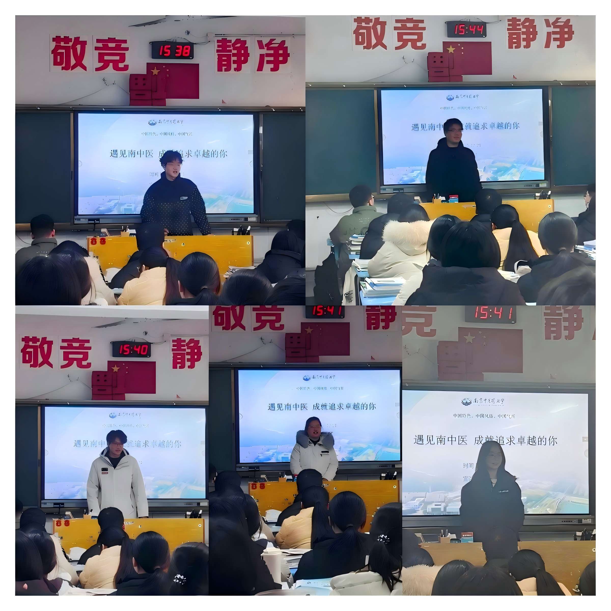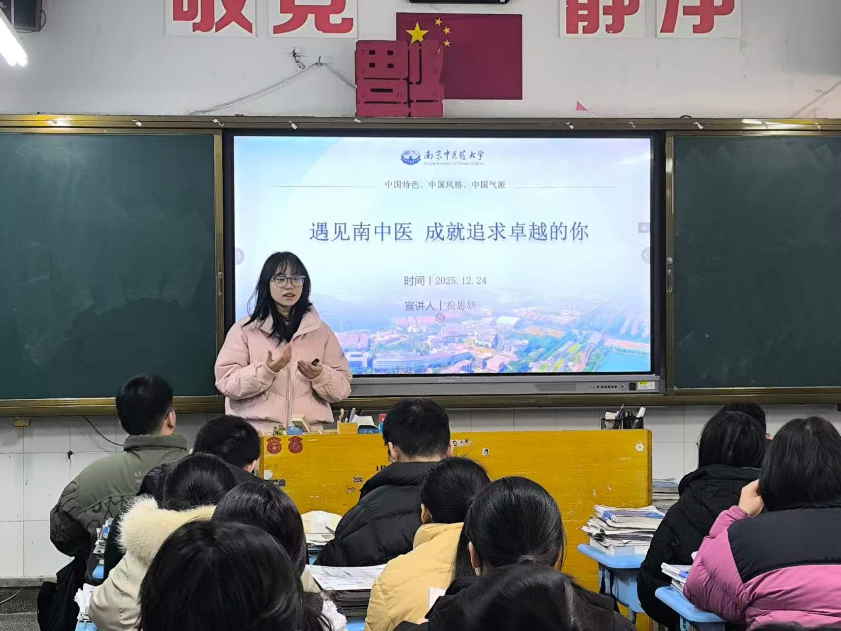 2026年1月27日,南京中医药大学“遇见南中医·优秀学子中学母校行”扬帆杏林宣讲团重返母校江苏省江都中学,面向高三(8)班的同学们开展了一场内容丰富、气氛热烈的大学宣讲与经验分享活动。本次活动由中医学院祝思妍同学带队,队员方浩、周宇、张润泽、周轶、毛李志共同参与,旨在搭建高校与中学的桥梁,传递南中医声音,助力学弟学妹备战高考、规划未来。