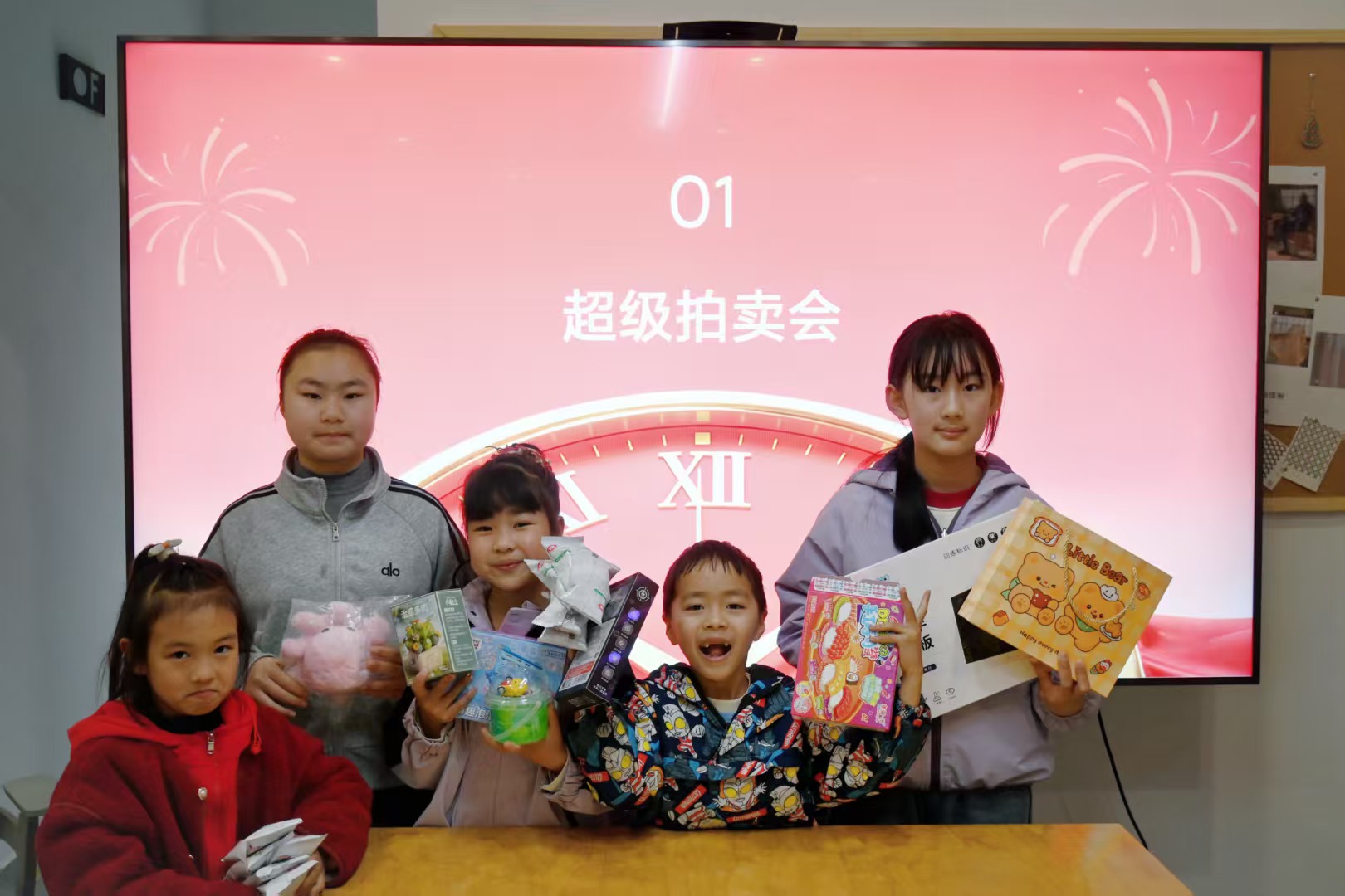 图为“翠脉兴源实践队”开展“超级拍卖会”活动,孩子们展示自己拍得的奖品。李书祺 供图