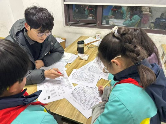 图为周佳奇同学在村中增设辅导班帮助孩子完成学业,解答疑惑。 周佳奇供图
