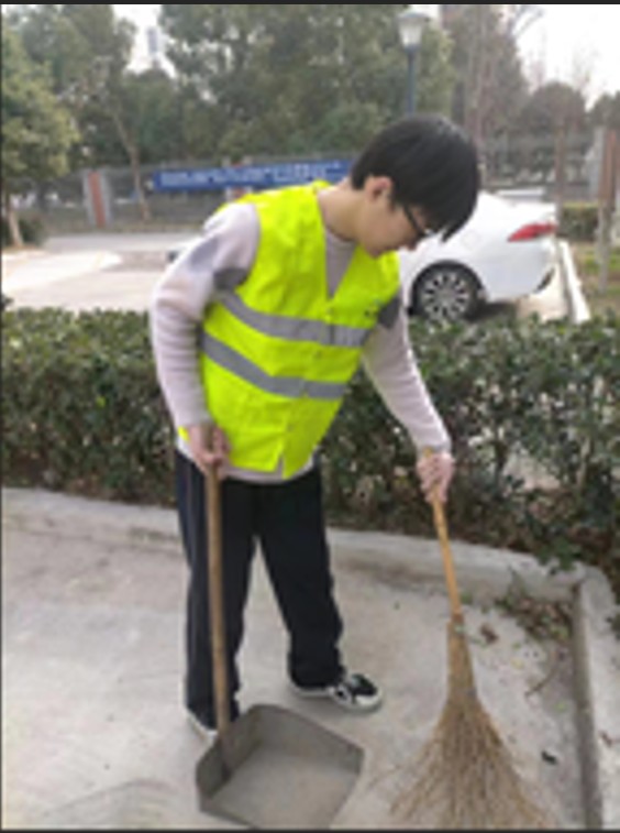 图为金雨鹏同学在社区中帮忙扫地,为社区环境做出贡献。 金雨鹏供图