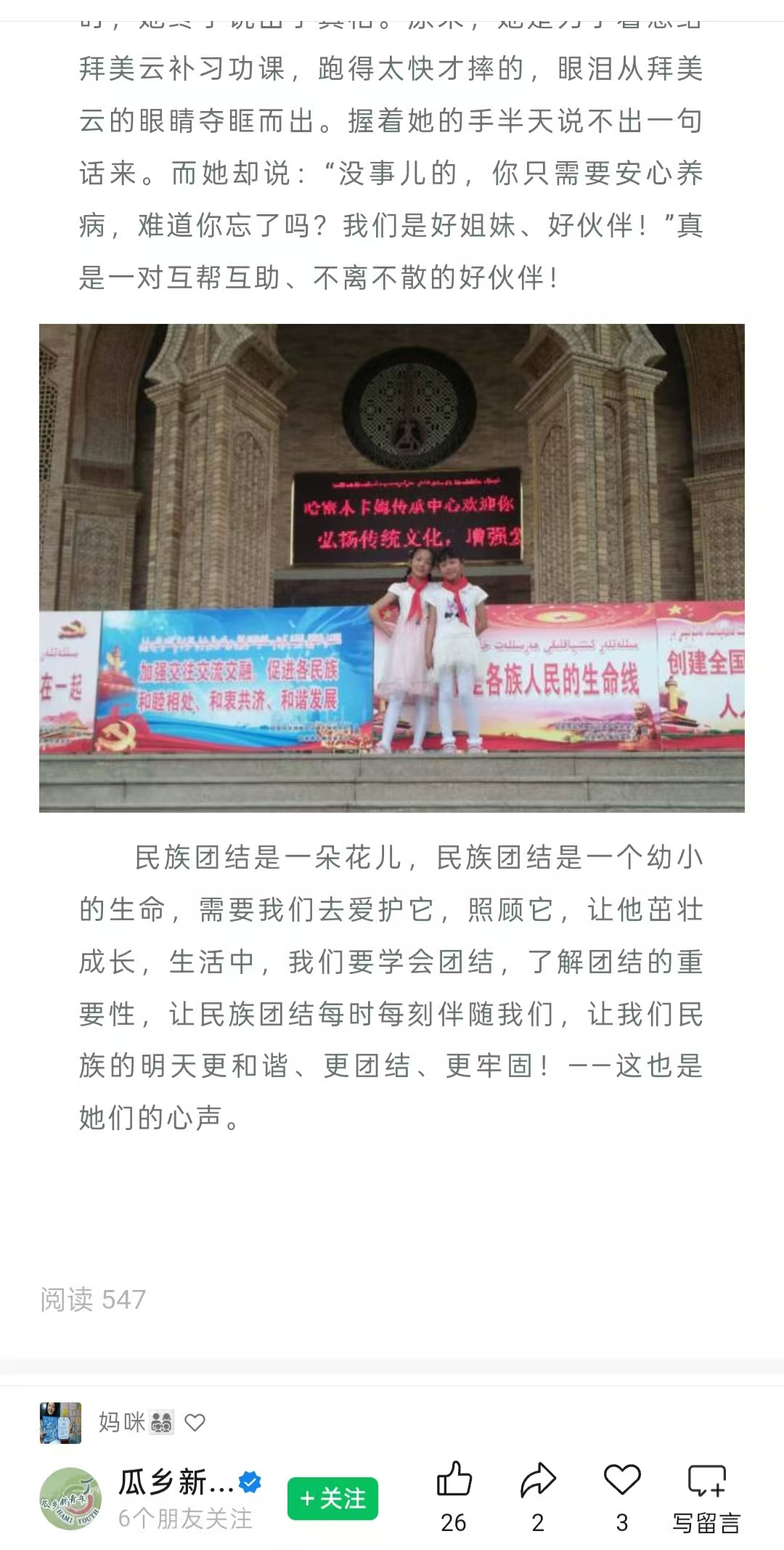 后来,我们的故事被学校的公众号报道了,叫“民族团结好伙伴”。那时候年纪小,只觉得是跟好朋友一起被表扬,很开心,但没有想得太深。