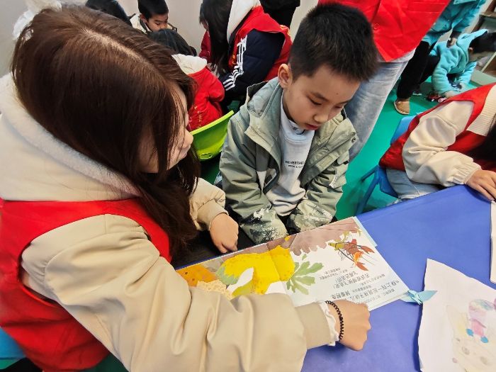 温馨的氛围中,志愿者们与孩子一对一结对,围坐在一起。大家精心准备了图文并茂的雷锋故事,一边指着生动的图画,一边用手势比划情节。孩子们专注地看着、学着,眼神中闪烁着对雷锋精神的理解与向往。志愿者们耐心讲解助人为乐、无私奉献的美好品质,让善良的种子在稚嫩的心田生根发芽。
