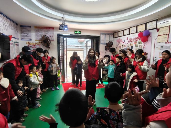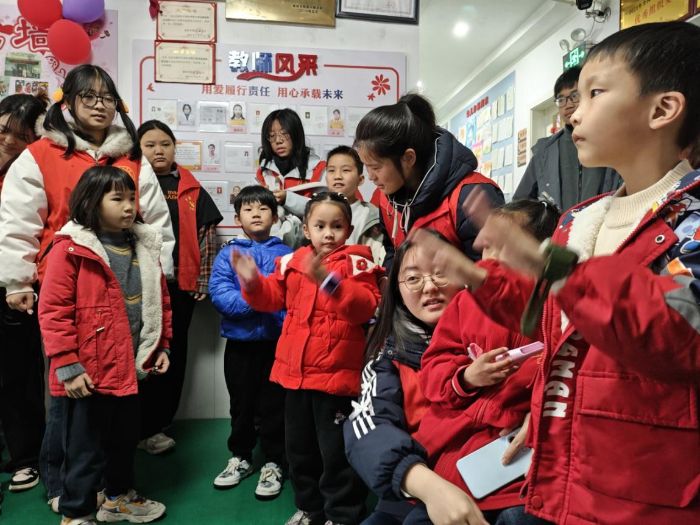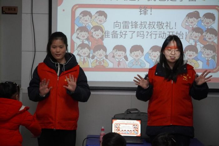 故事讲完,欢快的音乐响起。志愿者们带领孩子们学习与雷锋精神、节约、友爱相关的手势舞。孩子们跟着节奏挥动小手,动作虽显生涩,却透着认真与快乐。指尖舞动间,温情无声流淌,孩子们的参与感、表现力与沟通能力在律动中悄然提升。