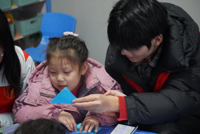 折纸声沙沙作响,志愿者们俯身轻语,手把手带着小朋友们趣味折纸。一张张彩纸在指尖翻转,化作灵动的千纸鹤、活泼的小青蛙。孩子们专注的眼神里闪着光,每完成一件作品,都骄傲地高高举起。活动以折纸为桥,传递善意与陪伴,让雷锋精神在指尖绽放,也为孩子们留下快乐与温暖。