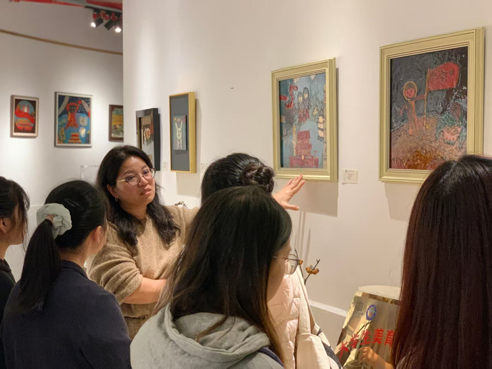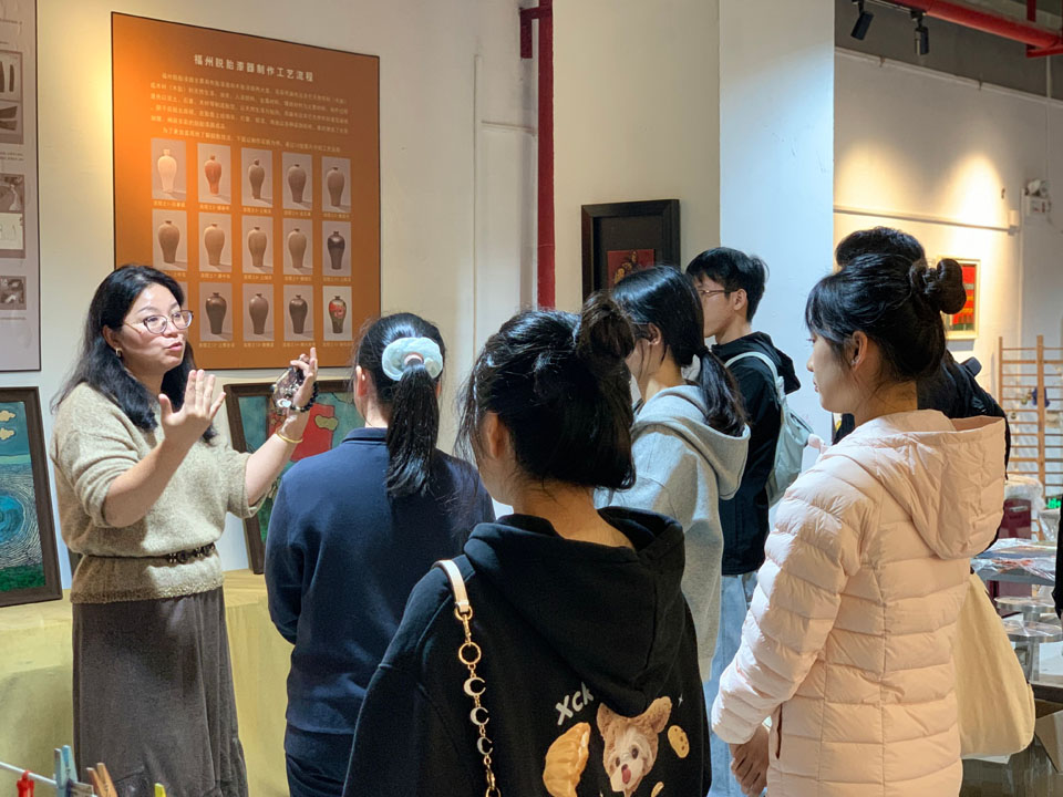 活动伊始,团支部书记罗思淇从生活常见事物出发,生动讲解对称轴与轴对称图形的概念,学生们积极互动,初步感知轴对称图形的平衡与和谐。随后,由2023级国画班团支部成员李子凡主持,将学生分为绘画、拼贴与剪纸三组,简要介绍创作方式并展示范例。在创作环节,学生们热情投入创作,现场气氛活跃。课堂结束后,福州市麦浦小学校长陈潘春邀请支部成员参观“漆趣斋”工作室,着重介绍了学生漆画作品及学校美育工作,并对本次活动提出建议,呼吁师范生重视美育教学工作。