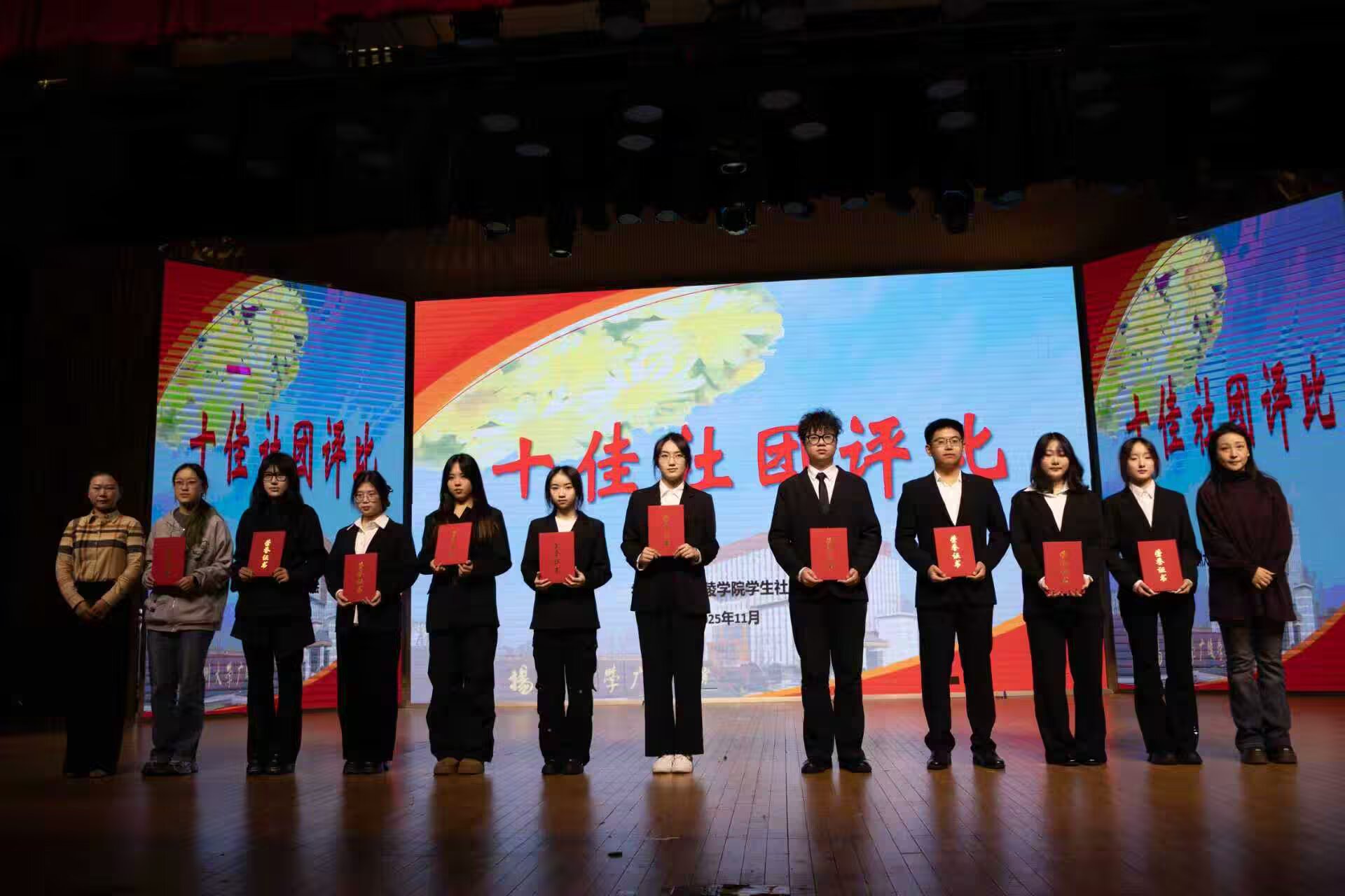 活动现场,各参评社团依次登台,用生动的演示、详实的报告和精彩的互动,展现了在文化传承、学术科研、志愿服务、文艺体育等领域的丰硕成果。从传统文化社团的古韵雅集,到科技创新社团的奇思妙想;从公益服务社团的责任担当,到文艺表演社团的活力绽放,每个社团都以独特的魅力赢得了评委的认可与现场观众的阵阵掌声。评委团围绕社团组织建设、活动影响力、创新能力等维度进行专业评审,最终综合现场表现与日常考核,评选出“十佳社团”。