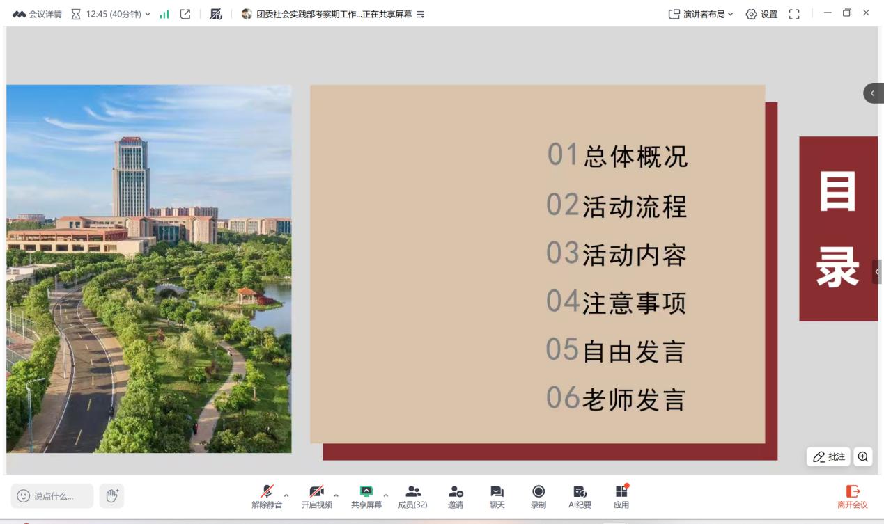 为扎实推进寒假社会实践工作开展,确保2026年寒假“回访中学母校”社会实践活动落地见效、有序推进,1月13日晚,湛江科技学院会计学院以线上形式顺利召开2026年寒假“回访中学母校” 社会实践活动工作部署会,为即将参与实践的学子明晰活动要求、梳理工作思路、凝聚行动力量。