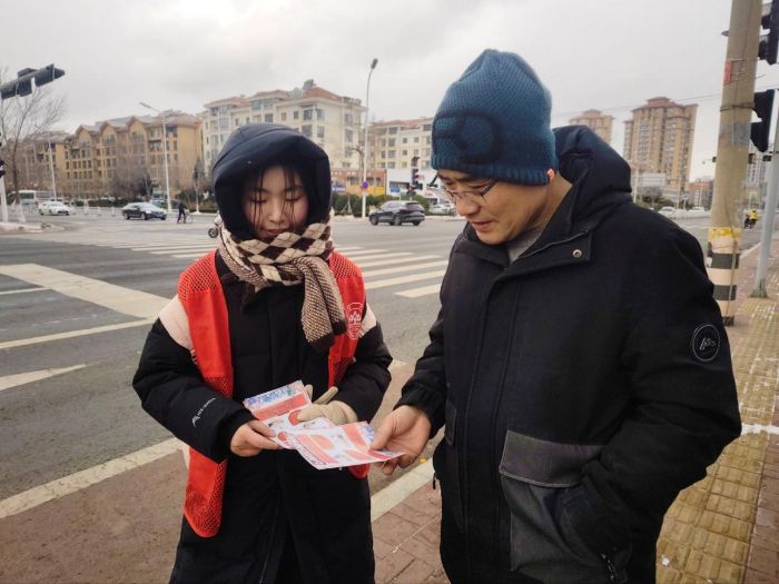 紧接着,宣传团成员转赴田和街道田西社区,在城市主干道旁的人行区域开展流动宣传。成员向过往行人发放急救手册,针对冬季高发的冻伤、滑倒摔伤等意外状况,讲解现场急救与处置要点,旨在提升居民应对季节性突发意外事件的实践能力。