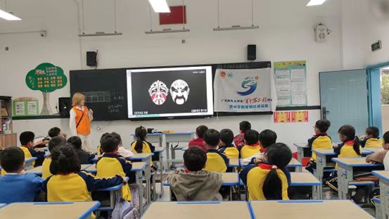 课堂伊始,队员们以一段经典粤剧《帝女花》选段引入,悠扬的唱腔与华美的戏服瞬间吸引了所有孩子的目光,戏曲独有的艺术氛围悄然弥漫。随后,队员通过图文并茂的讲解,为孩子们初步解构了粤剧的“六柱制”行当体系,生、旦、净、末、丑等角色概念以生动有趣的方式呈现,在孩子们心中埋下了好奇的种子。