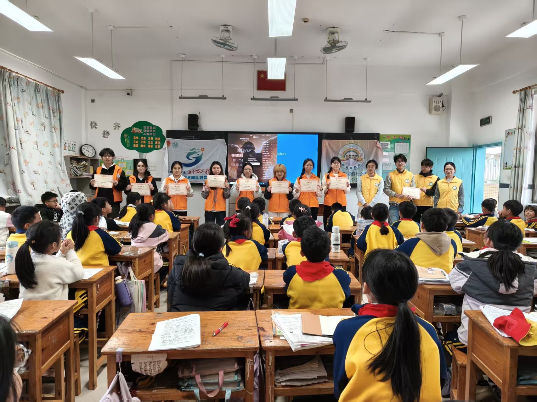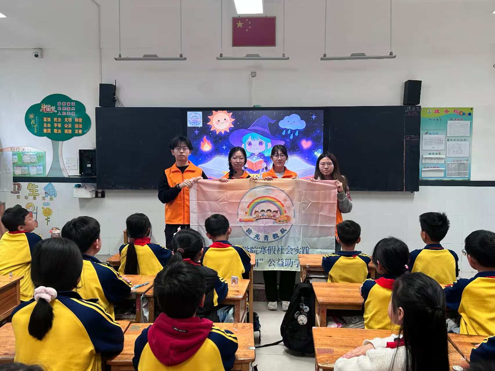 在完成心理课堂的同时,拾光青教队的队员们也积极配合学校工作,减轻授课老师们的工作负担,开展课堂辅导。在队员们的耐心指导下,原本对难题一筹莫展的孩子逐渐掌握了解题思路,一些性格内向的孩子也慢慢打开心扉,主动举手提问,学习积极性显著提升。
