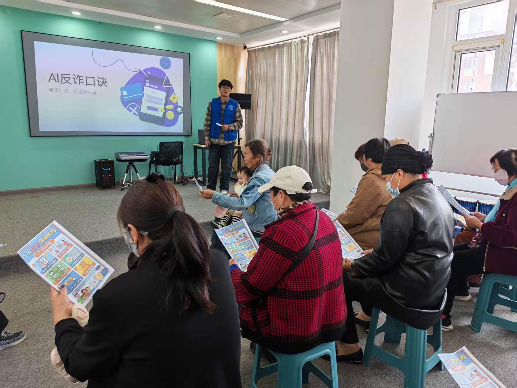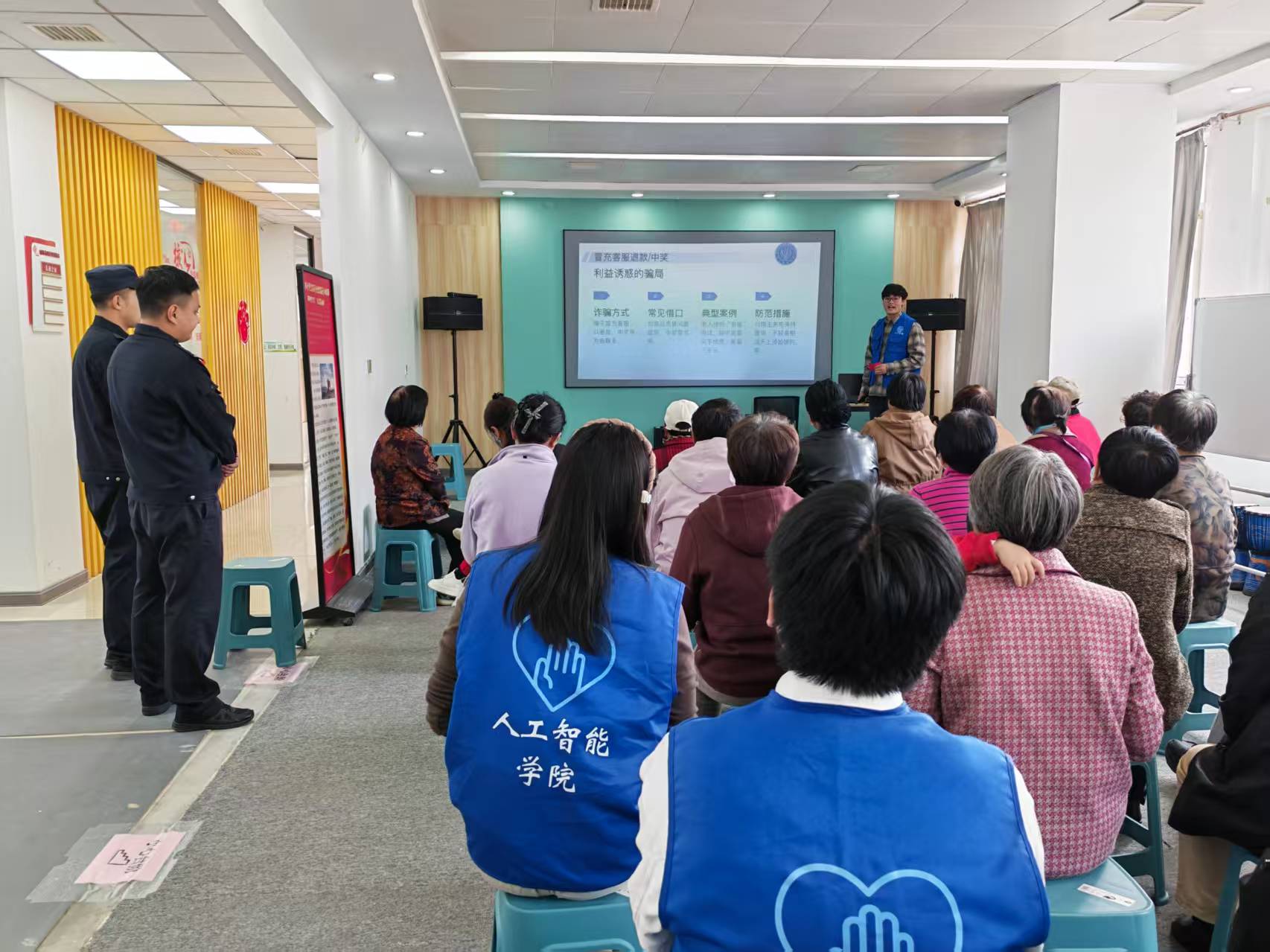 本次活动采用主题宣讲+情景演绎的形式,精准贴合老年群体接受习惯。活动现场,学院志愿者依托专业知识,用通俗语言拆解AI诈骗典型手段、剖析老年群体高发诈骗场景,详细讲解实用防范技巧,并普及AI反诈“六不六要”口诀,把专业技术知识转化为易懂易记的防骗技能。